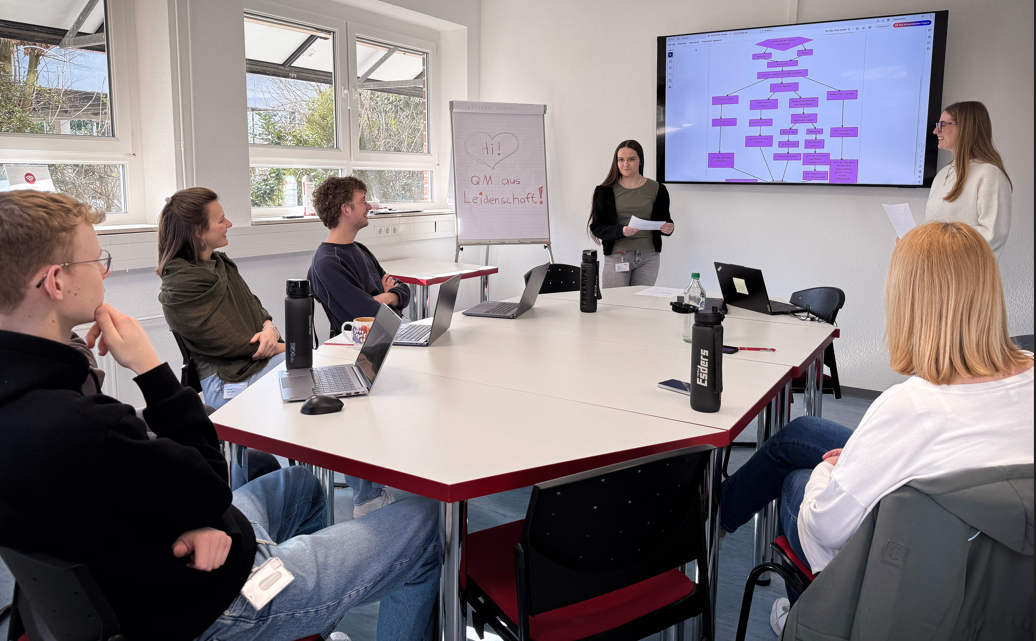 Von Anfang Februar bis Anfang März setzten wir uns in einem Workshop umfassend mit den Grundlagen auseinander. Zunächst klärten wir, was Qualität überhaupt bedeutet und welche Aufgaben das Qualitätsmanagement im Unternehmen übernimmt. Anschließend ging es an die praktische Umsetzung: In Zweiergruppen entwickelten wir eigene Arbeits- und Verfahrensanweisungen oder stellten Prozesse mithilfe von Flussdiagrammen dar. Ziel war es, die theoretischen Inhalte greifbar zu machen und ein besseres Verständnis für betriebliche Abläufe zu bekommen.